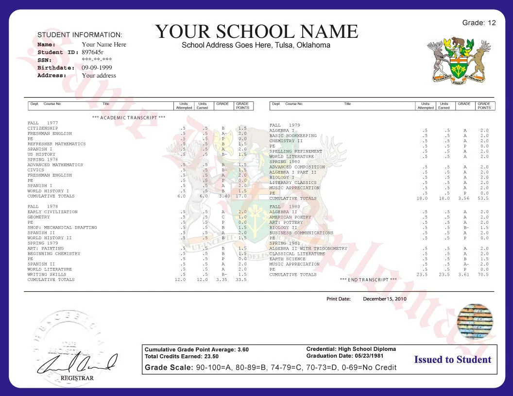 Yes, the transcripts are made from real designs we have on hand, ensuring they look great and are backed by our 100% trust factor guarantee. So they are authentic looking. Authentic designs add credibility and a professional appearance to the high school transcript. Rest assured, these benefits guarantee a high-quality document for your needs. However they are NOT issued by the school or recognizes by the school. They are copies… See full answer »